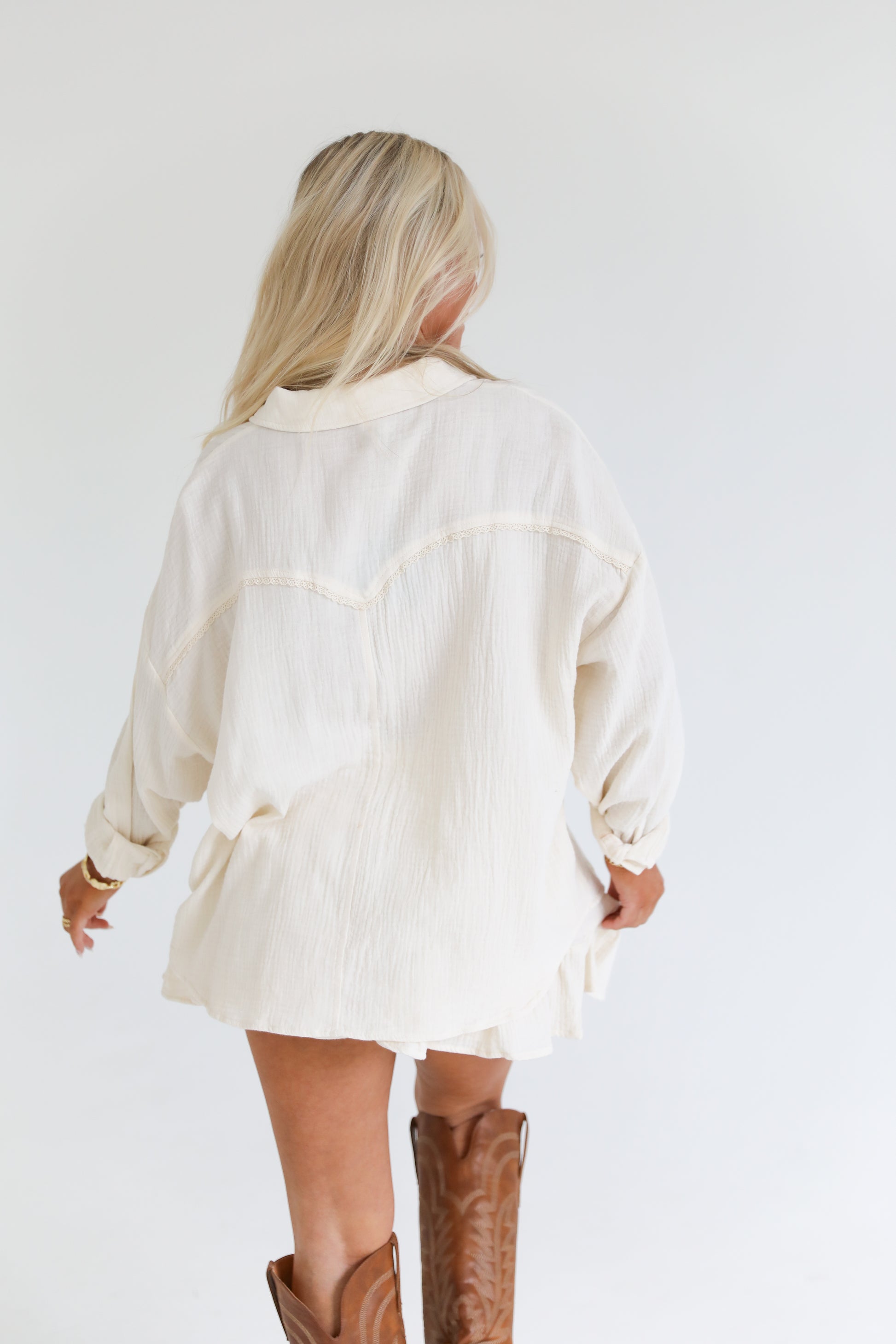 The Autumn Breeze Linen Set in cream is the perfect transitional two-piece for the season. Designed with a lightweight button-down top and a tiered mini skirt, this set combines comfort and style for any occasion. Dress it up with boots and gold jewelry for fall outings or keep it casual with sneakers for everyday wear.