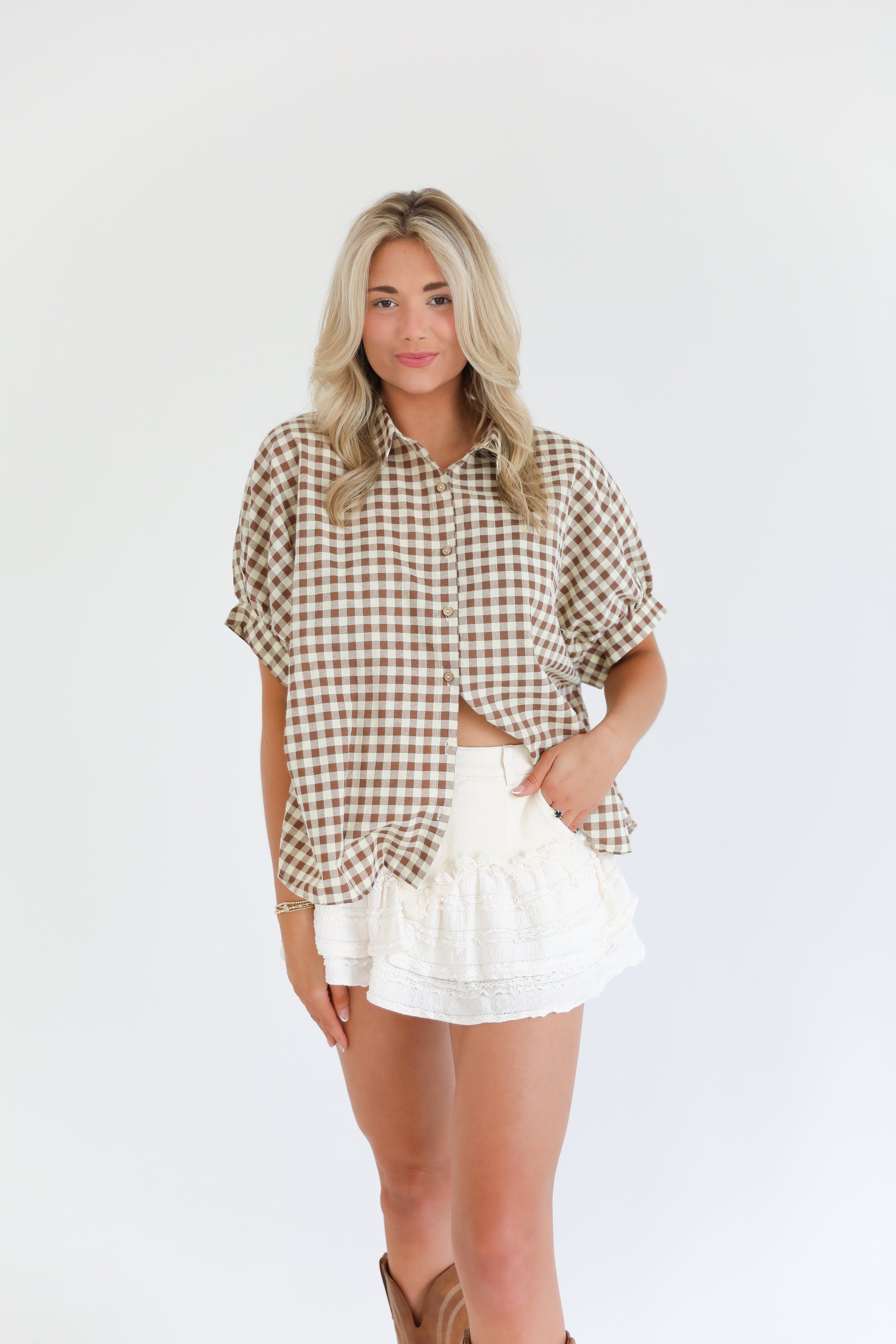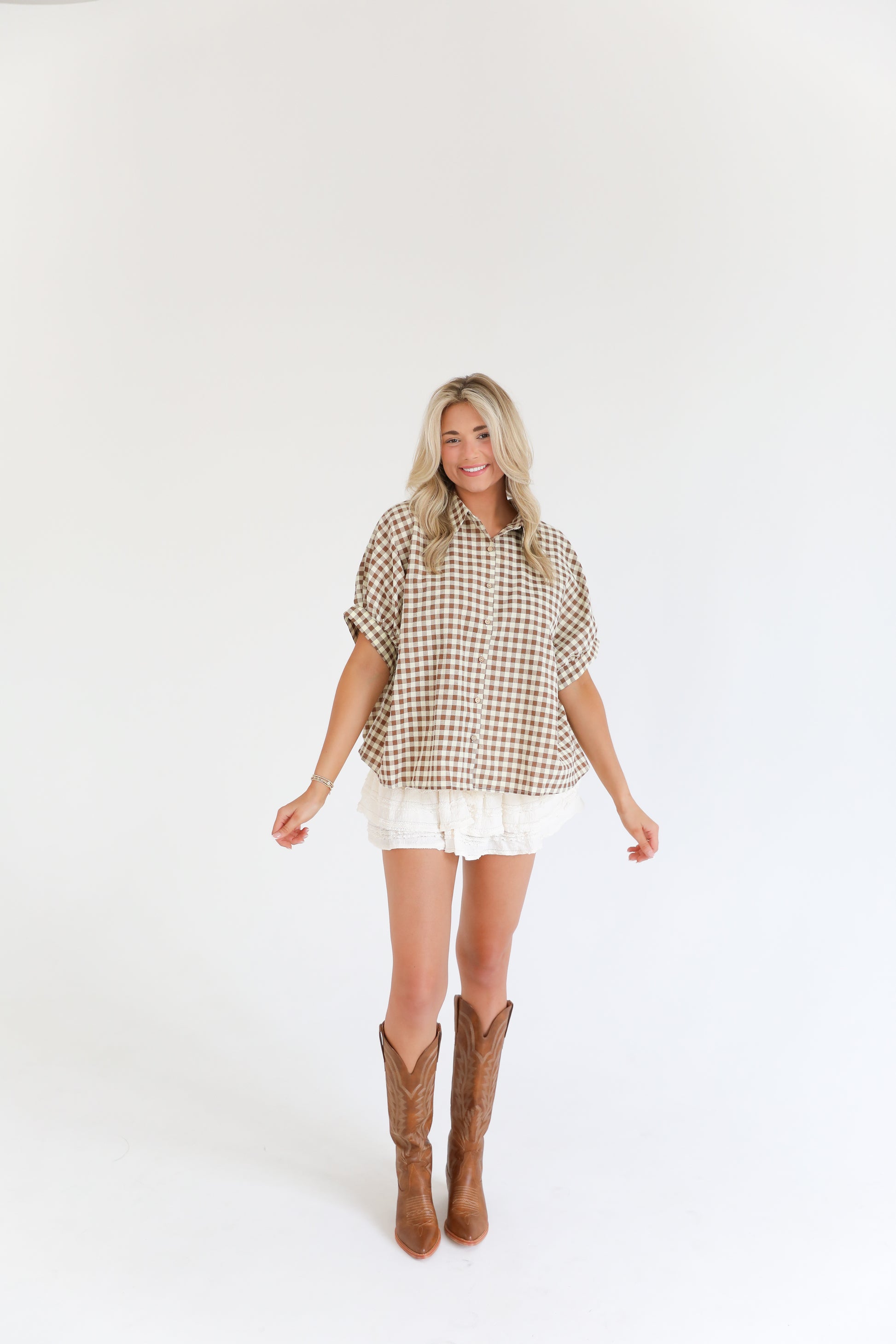 The Cider Season Blouse in brown gingham is a fall essential. Its cozy fabric and versatile fit make it perfect for layering with denim, skirts, or leggings. A boutique favorite for everyday wear, gamedays, and seasonal gatherings.