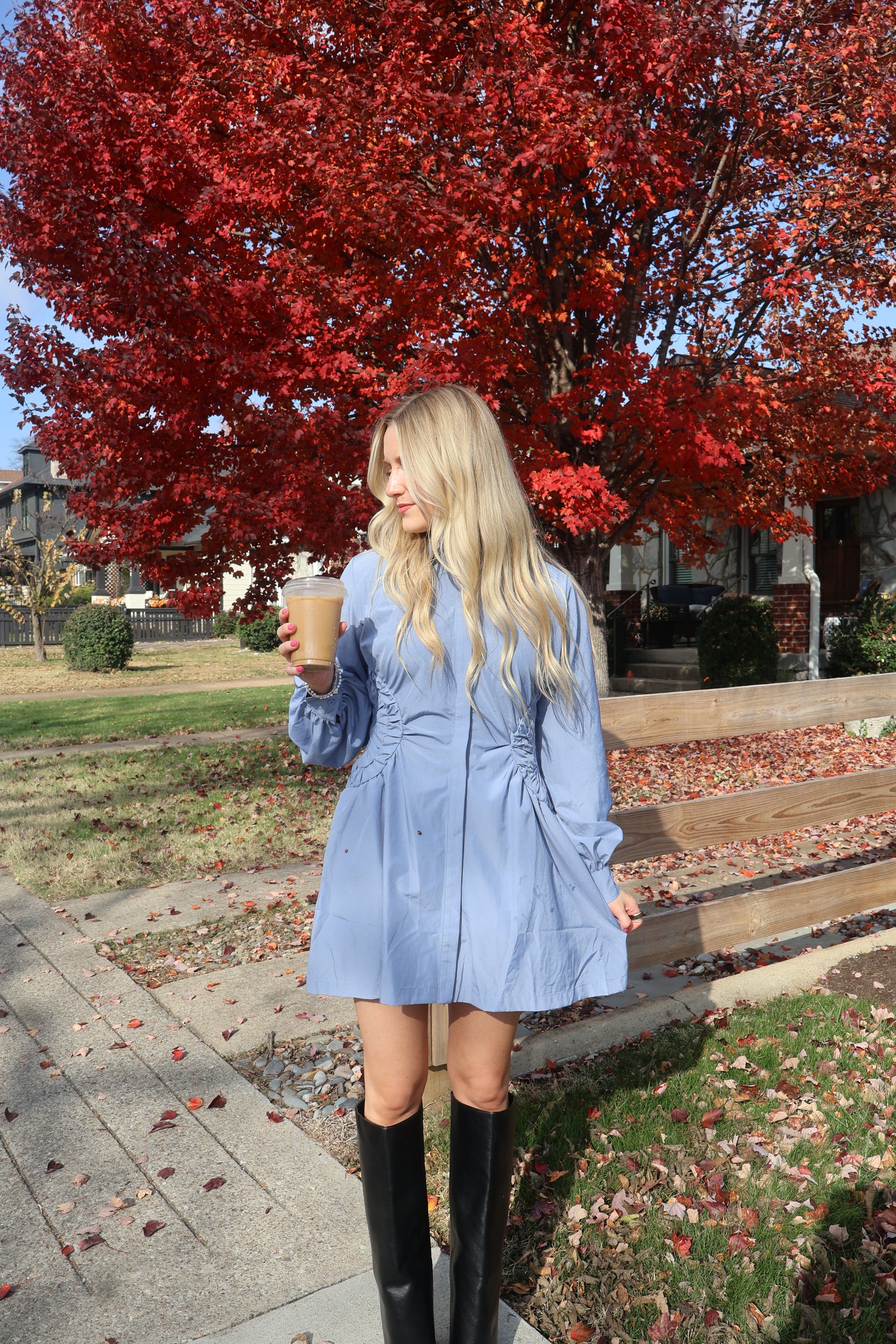 The Harvest Blue Dress is a lightweight, flowy mini with a soft chambray-blue look and a flattering, relaxed silhouette. Featuring long sleeves, subtle texture, and an easy tiered design, it’s the perfect fall dress for coffee runs, brunch, or everyday wear. Style with boots for the ultimate cozy-season outfit.