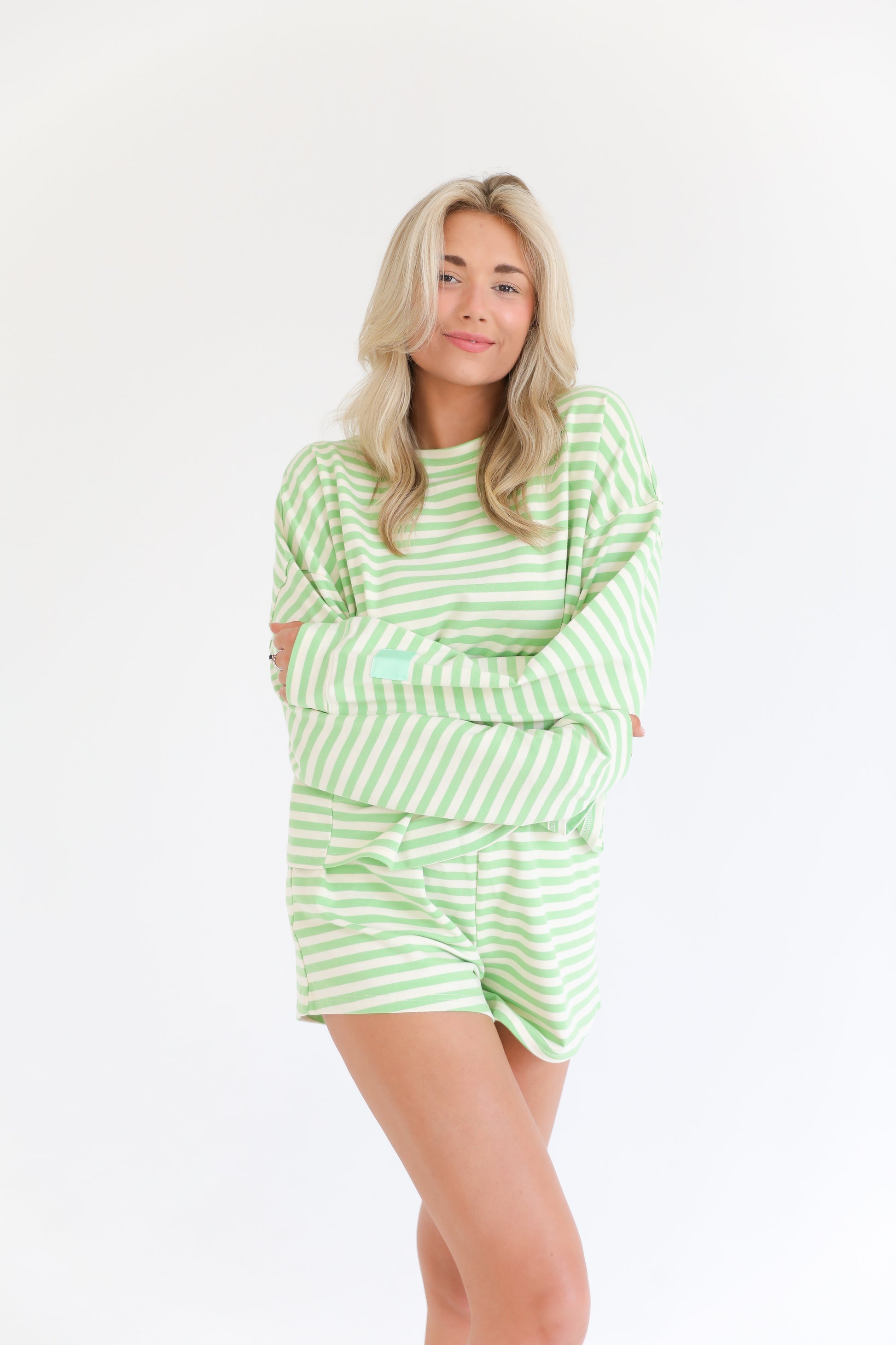The Morning Latte Shorts in green are the perfect balance of comfort and style. Featuring a stretchy waistband and soft knit fabric, these shorts are ideal for lounging, casual days out, or pairing with the matching pullover for a full fall-ready look.