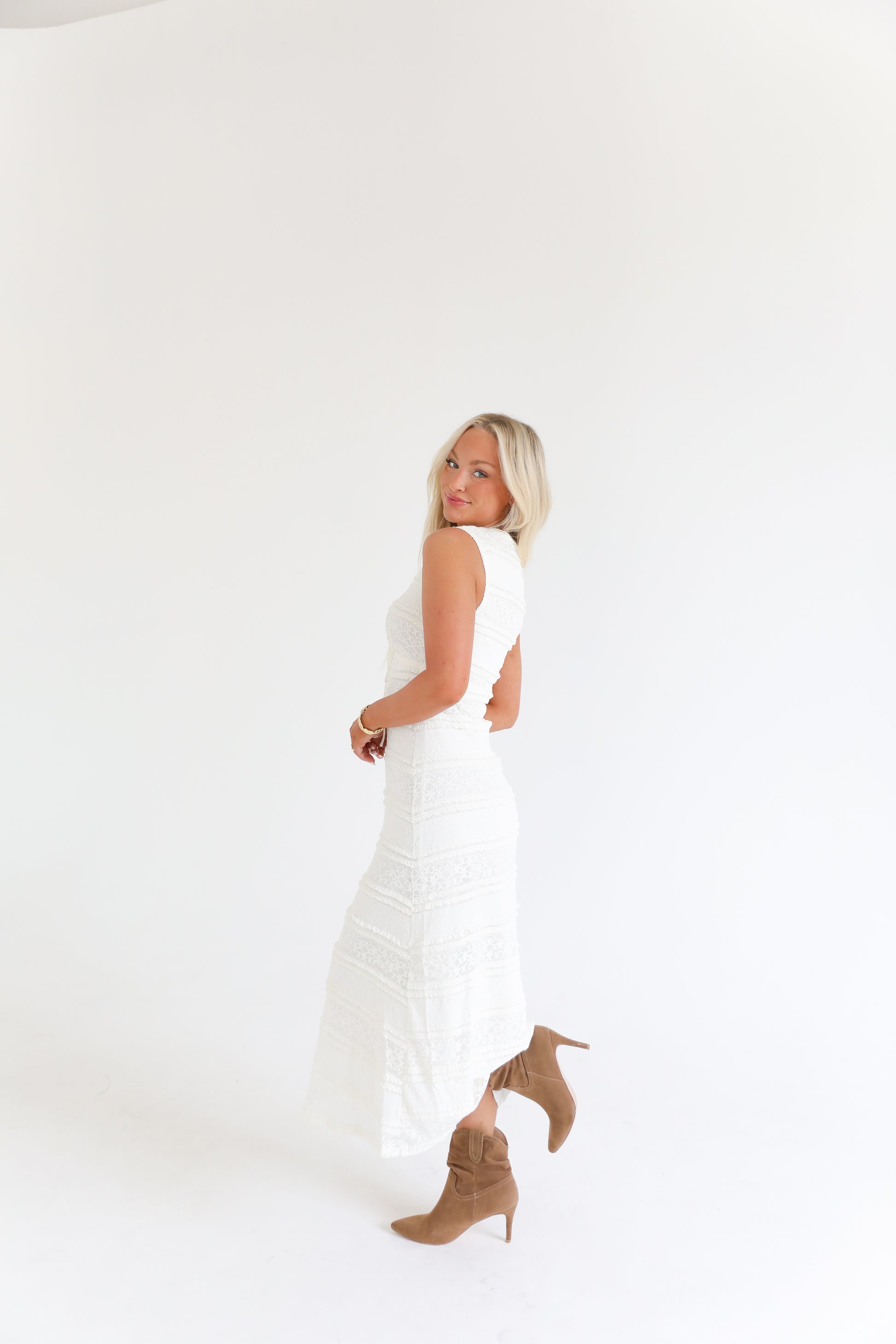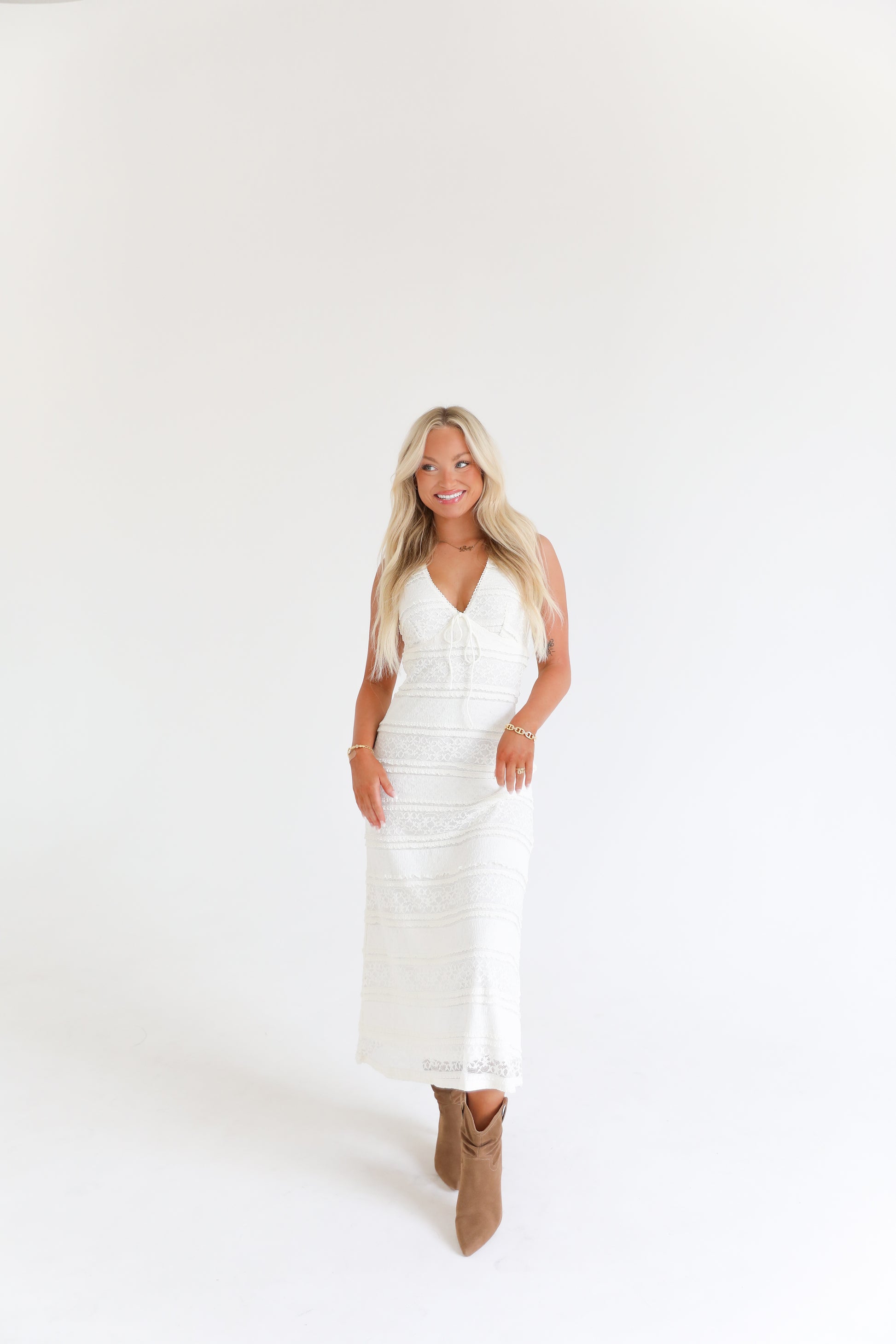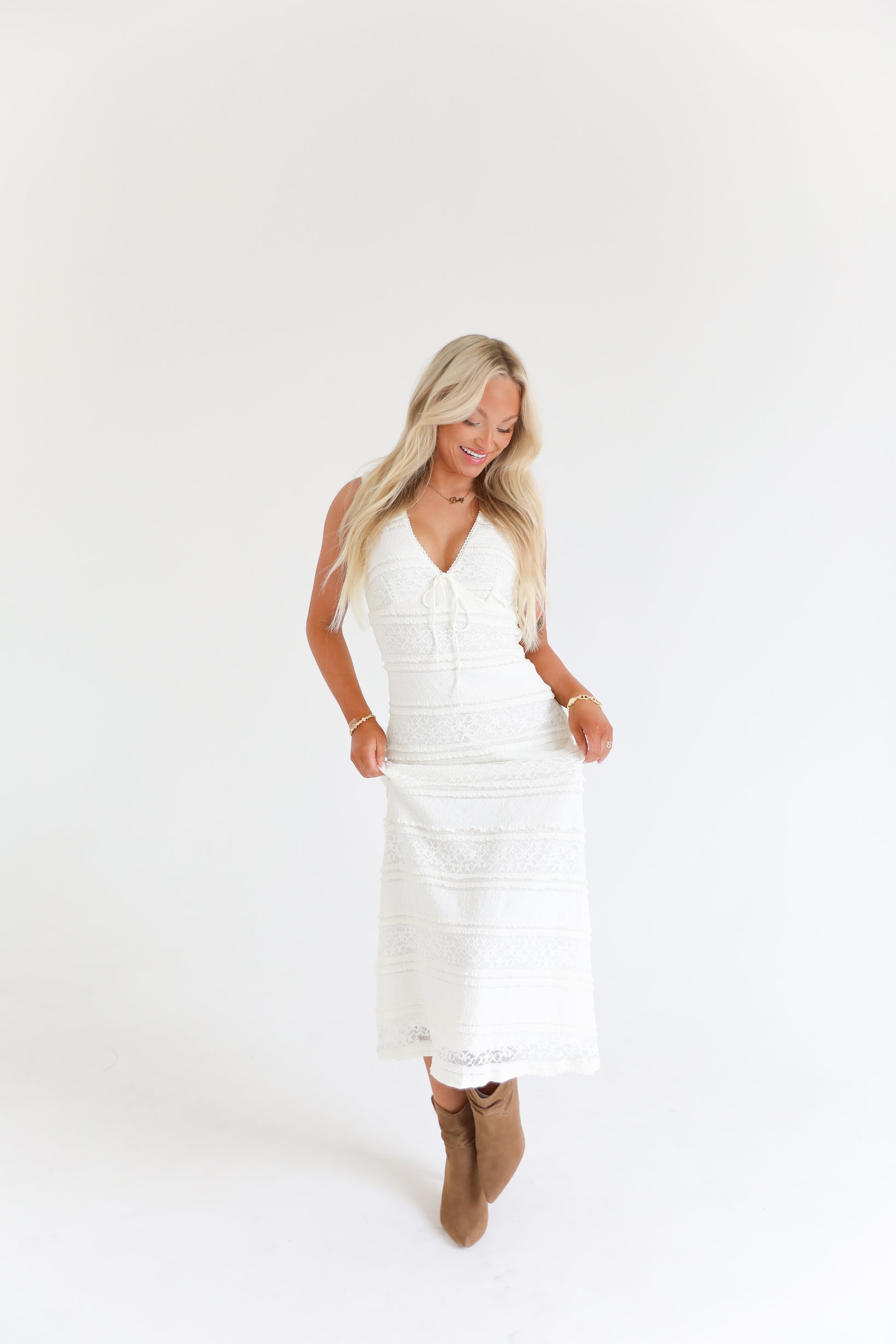 Turn heads in the Southern Nights Midi Dress — a timeless cream midi featuring a flattering v-neckline, figure-skimming silhouette, and delicate lace details. Perfect for bridal events, graduations, or summer nights, this elegant dress is the ultimate closet staple under $100.