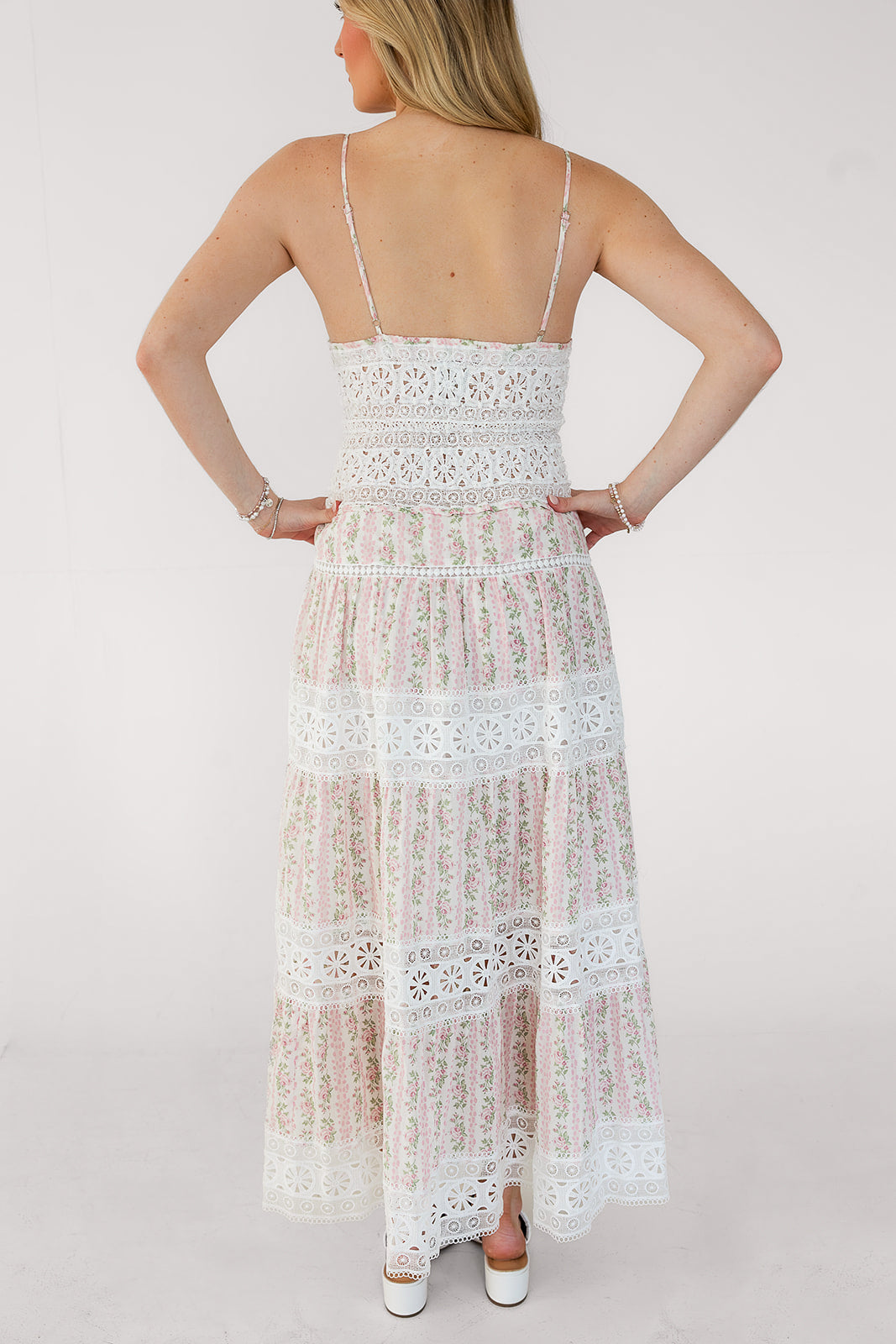 Whispering Petals Maxi Dress featuring a flattering fitted bodice with adjustable straps and a flowy maxi-length silhouette. Designed with a side zip closure and detailed lace paneling throughout, this dress is fully lined for coverage while maintaining a delicate, feminine look. Perfect for spring events, bridal showers, vacations, and special occasions.